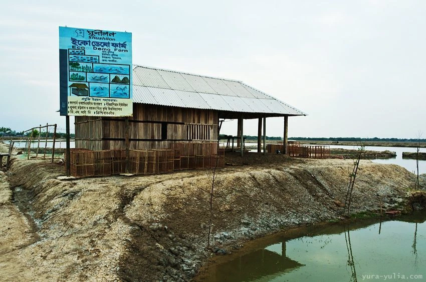 And we're going to the demo farm voluntary environmental organization Shushilan. The farm is clearly shown how to simultaneously grow mangrove shoots Sundari (for further planting in the wild), raise fish, shrimp and crabs in a single artificial pond. Classes are held for the community and for the few local tourists. Foreigners to us here have seen only a few times.