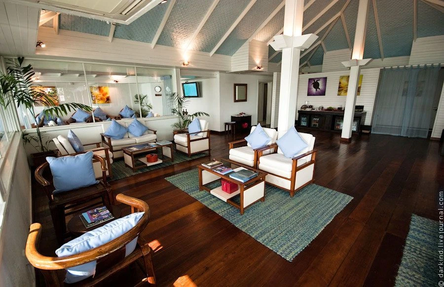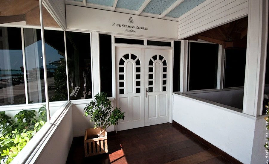 One of the features of the hotel Four Seasons, as well as the region in general, Maldives - the establishment of his time at the resort, other than the national time. Sometimes it's a half-hour, in this case had an hour and it happens that the resort / boat lives on the hour and a half ahead. This is to ensure that guests have seized more light time on vacation. At the equator, day / night are approximately 12 hours, respectively, around 6 am sunrise, sunset around 6 pm, on vacation few rises at 6 am, therefore, guests and shift - stood up at 9:00 am, and the sun as if would be at 8:00 am and formed an extra hour of sunbathing.
