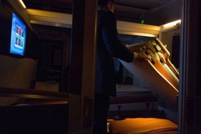 In Suites you do not just lie in a high chair. You will be asked to move and Singapore Airlines stewardesses turn your bedroom suite with a full size bed. When the neighbor "number" Let the partition is removed, it turns into a double bed. Zaf and the stewardess went about making the bed.